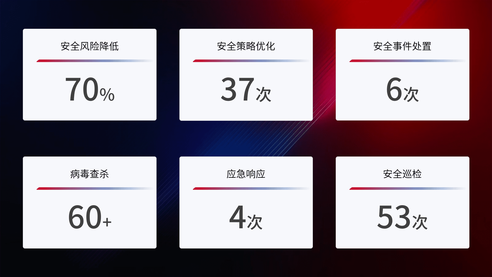 提供全面的安全事件报告体系,,,包括处置报告、、、、周报、、、季度和年度总结,,,结合持续监控,,,,帮助客户深入了解网络安全状况。。。