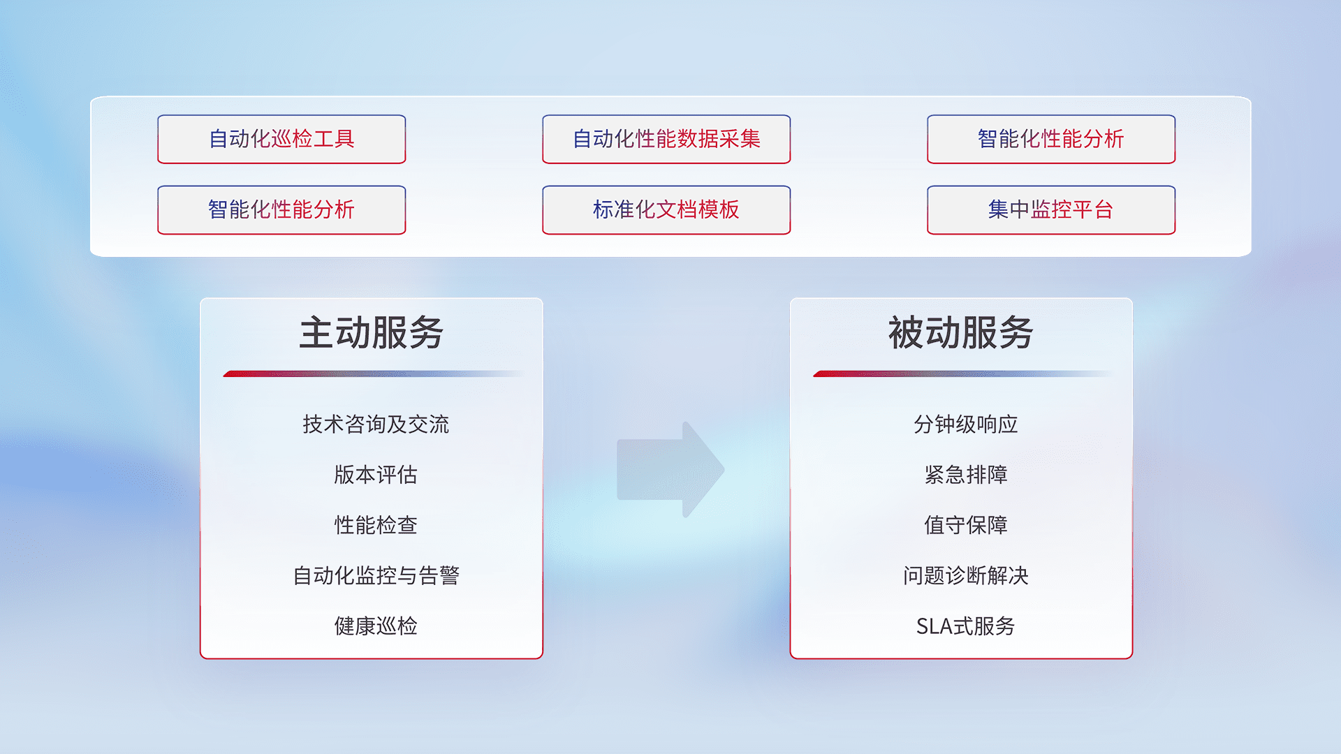 智能化工具和标准化文档,,,保障服务质量,,提供主动服务(包含技术咨询、、、版本评估、、、、性能检查、、、自动化监控与告警、、健康巡检)和被动服务包含(分钟级响应、、紧急排障、、值守保障、、、、问题诊断解决、、、、SLA服务)。。。